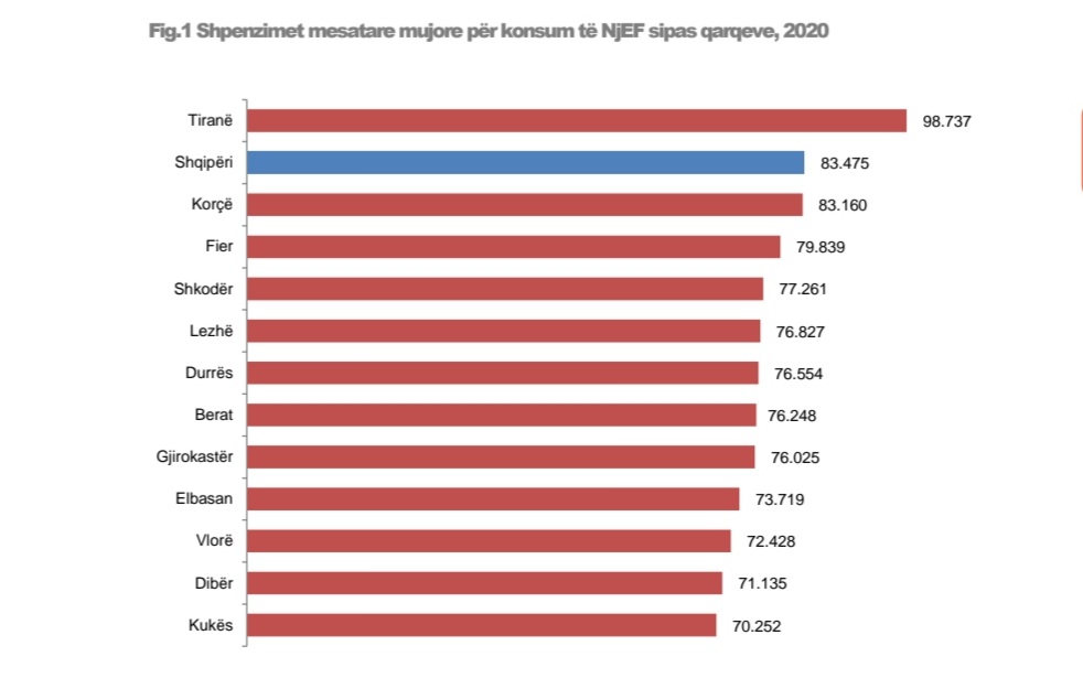 Në vitin 2020, qarku i Tiranës paraqet shpenzimet mesatare më të larta mujore për konsum. Një NjEF në qarkun e Tiranës shpenzon për konsum mesatarisht 98.737 lekë në muaj. Qarqet që paraqesin shpenzimet mesatare më të larta për konsum, pas qarkut të Tiranës, janë Korça me 83.160 lekë dhe Fieri me 79.839 lekë në muaj për NjEF. Qarqet me nivel më të ulët të shpenzimeve mesatare mujore për konsum janë qarku i Kukësit me 70.252 dhe i Dibrës me 71.135 lekë në muaj për NjEF. Rritjen më të madhe të shpenzimeve e paraqet qarku i Elbasanit me 7,0 %, ndjekur nga qarku i Dibrës me 4,9 %.