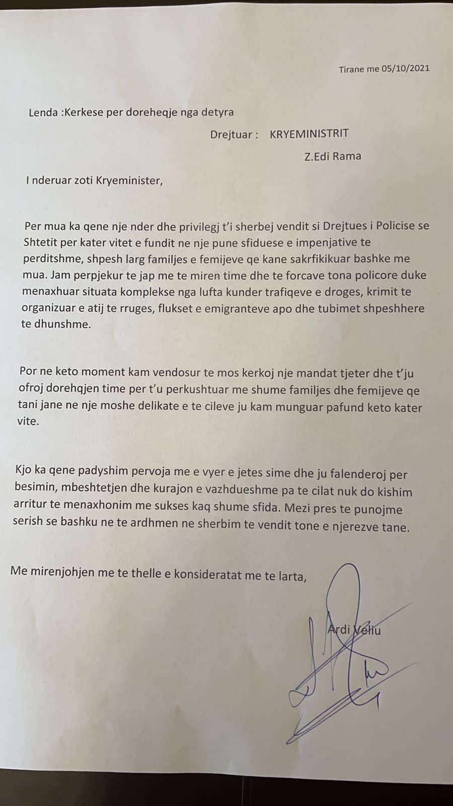 Ai publikoi gjithashtu edhe letrën e dorëheqjes, ku Veliu jep motivet që e çuan në këtë vendim. Në këtë letër, Veliu shkruan se ka vendosur t’u përkushtohet më shumë familjes dhe fëmijëve të tij, që tani janë në moshë delikate.