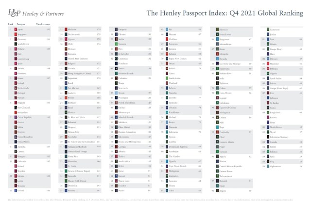 Henley & Partners, një firmë globale këshilluese për shtetësinë, me qendër në Londër, përdor të dhënat nga Shoqata Ndërkombëtare e Transportit Ajror për të renditur pasaportat duke u bazuar në numrin e përgjithshëm të destinacioneve që mund të aksesojnë mbajtësit e tyre, pa pasur nevojë të aplikojnë për vizë. Indeksi përfshin 199 pasaporta dhe 227 destinacione udhëtimi.