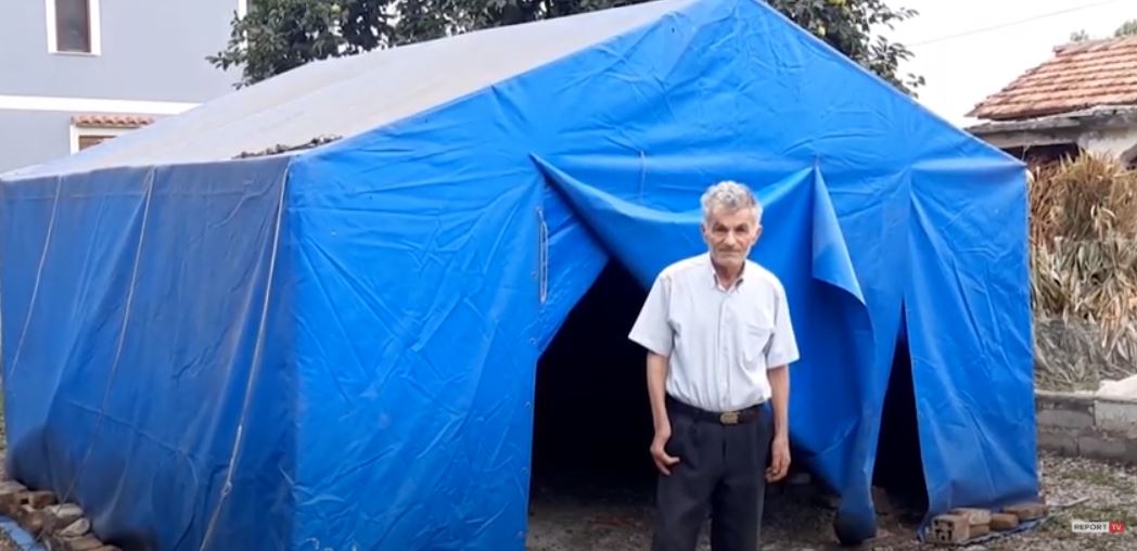 Anëtarët e familjes që marrin bonus qiraje, kanë ngritur një çadër në oborr ndërsa natën e kalojnë brenda shtëpisë së rrënuar, shkruan Shqiptarja.