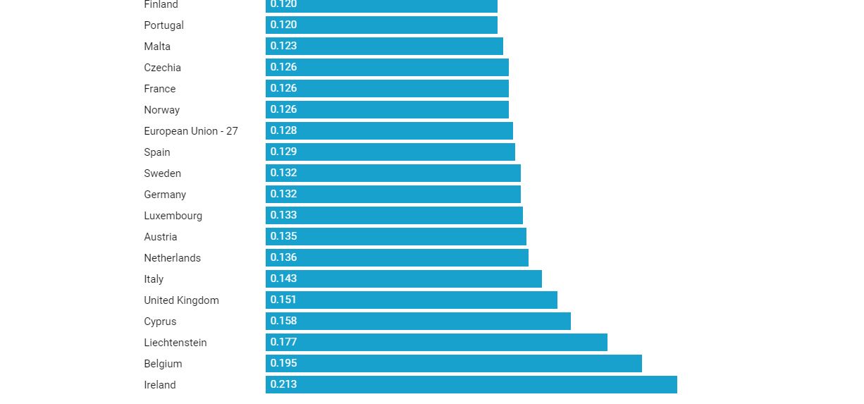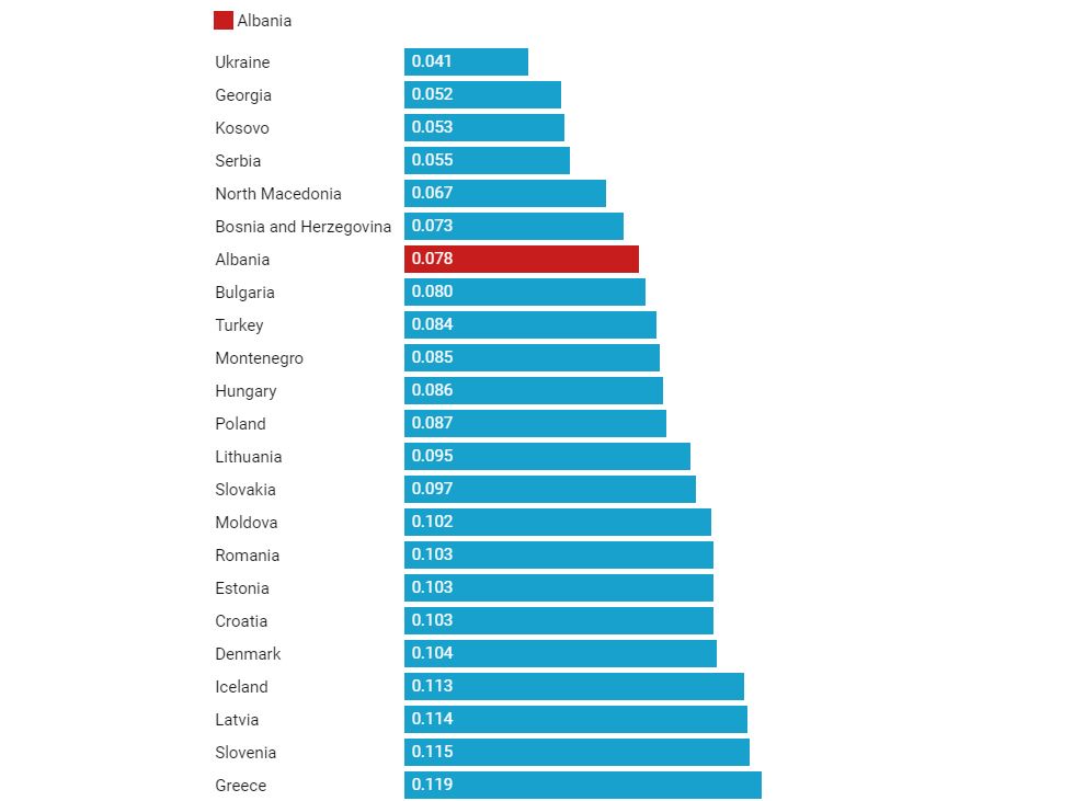 Në Europë, më e lira është Ukraina (0.041 euro/kvh), Gjeorgjia (0.052) dhe e treta më e lira është Kosova.