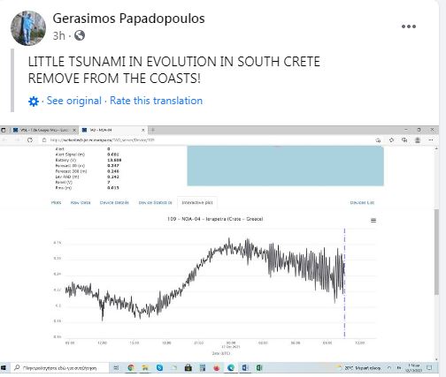 Sizmologu Gerasimos Papadopoulos në një postim në Facebook u bëri thirrje qytetarëve të largohen nga brigjet: “Cunami i vogël në progres në jug të Kretës. Qëndroni larg nga brigjet.“