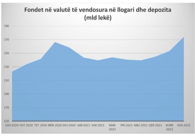 Ndërsa në total, fondet në valutë të mbajtura në Bankën e Shqipërisë në formën e depozitave, arritën në 109.4 miliardë lekë, me një rritje vjetore prej 28% krahasuar me të njëjtën periudhë të një viti më parë. Paralelisht, edhe vendosjet dhe depozitat në valutë në institucionet financiare jashtë vendit kanë arritur vlerën e 165.6 miliardë lekëve, me një rritje prej 20% krahasuar me një vit më parë. Gjithsej, vendosjet e fondeve në valutë të bankave shqiptare në llogari dhe depozita të institucioneve të tjera financiare kanë arritur në afërsisht 275 miliardë lekë ose rreth 2.3 miliardë euro.