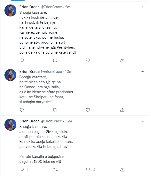 Shoqja kazetare, a duhen paguar 250 mije leke ne vit për një kanal me kukulla ku nuk ka asnjë kukull shqiptare, por veç kukulla te bëra jashtë? Për atë kanalin e bujqësisë, paguhet 1200 leke ne vit”- shkruan Braçe