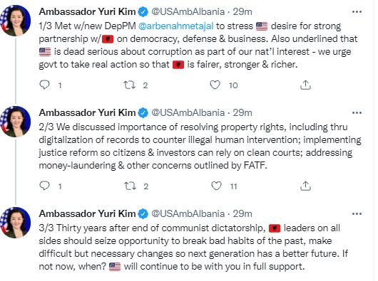 Tridhjetë vjet pas përfundimit të diktaturës komuniste, udhëheqësit e Shqipërisë nga të gjitha anët duhet të shfrytëzojnë mundësinë për të thyer zakonet e këqija të së kaluarës, për të bërë ndryshime të vështira, por të nevojshme, në mënyrë që brezi i ardhshëm të ketë një të ardhme më të mirë. Nëse jo tani, kur? SHBA do të vazhdojë të jetë me ju në mbështetje të plotë.”- shkruan zonja Kim.
