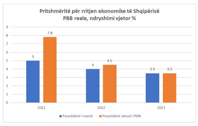 Fillimisht, Pasqyra Ekonomike Globale e tetorit, e publikuar së fundmi nga FMN, vlerësonte se ekonomia do të rritej me 5.3%, por parashikimi u rishikua nga Misioni që ishte në Shqipëri dy javët e fundit, si rrjedhojë e ecurisë së mirë të 3-mujorit të dytë, kur vendi u rrit me gati 18%.