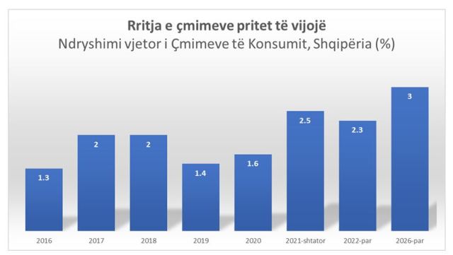 FMN pret, sipas Pasqyrës Ekonomike Globale, që inflacioni në Shqipëri të përshpejtohet. Në shtator, sipas INSTAT, indeksi i çmimeve të konsumit ishte 2.5%, më i larti që nga janari 2017. Tendenca në rritje pritet të vijojë në afatin e mesëm. Për vitin 2022, inflacioni, që mat ndryshimin e çmimeve të një shporte mallrash, pritet të arrijë në 2.3% dhe deri në vitin 2026 të shkojë në 3%, që është dhe objektivi i shënjestruar i Bankës së Shqipërisë, sipas parashikimeve të FMN-së.