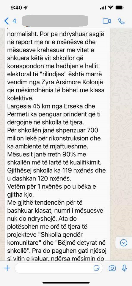 Boçi ka publikuar në “Facebook” një denoncim që i ka mbërritur, ku thuhet se në shkollën kryesore “Jani Vreto”, janë shtuar klasat kolektive për një nxënës më pak.