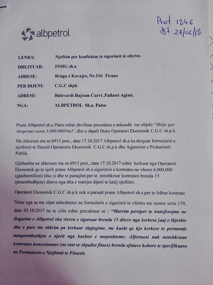 Fituesi i Ankandit u shpall kompania CGC me çmimin 80% të bursës. Pra nuk ka një çmim fiks, por çmimi është referencë e çmimit të bursës. Gjithsesi, kompania fituese e Ankandit nuk u paraqit për të lidhur kontratën për blerjen e gazit. Në këto kushte, ‘Albpetrol’ sh.a bëri ekzekutimin e garancisë së ofertës, duke ndjekur rrugën ligjore.”– shkruan Gjiknuri.
