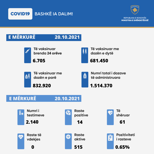 “20 Tetor 2021: Ministria e Shëndetësisë, sipas të dhënave nga Instituti Kombëtar i Shëndetësisë Publike të Kosovës, informon: