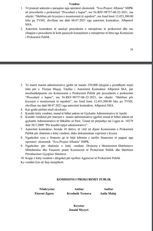 Komisioni i Prokurimi Publik, ka vendosur që të anulohet procedura e tenderit si dhe ka marrë masën administrative me gjobë në vlerën 250,000 (dyqind e pesëdhjetë mijë) lekë për z. Florjan Muçaj, Titullar i Autoritetit Kontraktor Albpetrol ShA, për mosbashkëpunim me Komisionin e Prokurimit Publik për procedurën e prokurimit “Procedurë e hapur”, me Nr.REF-98757-06-22-2021, me objekt: “Shërbim për kryerjen e monitorimit të mjedisit”, me fond limit 12,453,300.00 leke pa TVSH, zhvilluar me datë 08.07.2021 nga autoriteti kontraktor, Albpetrol SHA.