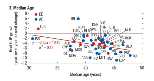 Në Itali, mosha mediane po i afrohet 50 vjeç (47.2 në vitin 2020), duke qenë shteti me popullsi më të vjetër në Europë, së bashku me Gjermaninë (46), Portugalinë (45.5), Greqinë (45.2). të gjitha këto shtete, ndonëse me popullsi më të plakur kishin vdekshmëri më të ulët shtesë sesa Shqipëria (në Gjermani rritja e vdekshmërisë shtesë ishte 5%, ndër më të ulëtat në Europë, në Greqi më pak se 10%).