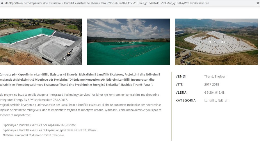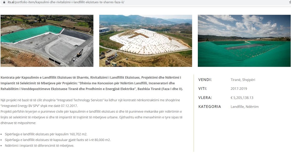 Sipas asaj që deklaron vetë kjo kompani në faqen e saj zyrtare, ITS është ajo që ka ndërtuar landfillin dhe kapsulimin e mbetjeve në Elbasan, është ajo që ka ndërtuar landfillin dhe po punon në Vlorë, dhe në Fier.