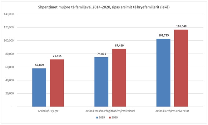 Në vitin 2020 një familje me kryefamiljarë pa arsim shpenzoi në muaj mbi 71 mijë lekë me një rritje 23 % nga viti 2014. Në të kundërt, familjet që kishin kryefamiljarin me arsim të lartë kishin rritjen më të ulët të shpenzimeve mujore për konsum. Një familje me arsim të lartë shpenzoi gjatë një muaji mesatarisht 116 mijë lekë më 2020 me një rritje 13 % nga viti 2014.
