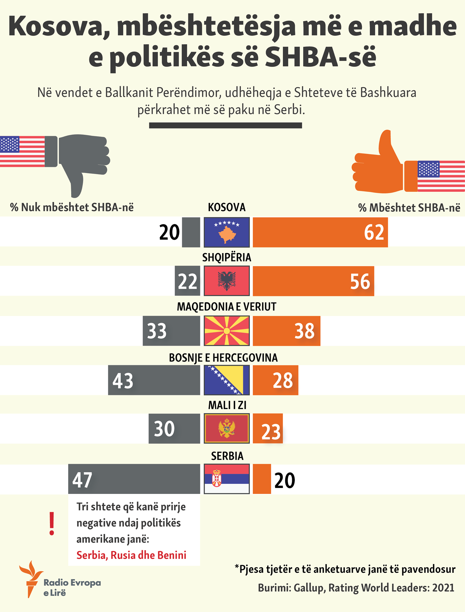 Në një infografikë të realizuar nga Radio Europa e Lirë, bazuar në të dhënat e siguruara nga kompania analitike amerikane Gallup, rezulton se 62 përqind e kosovarëve e përkrahin politikën e SHBA-ve, përballë 20% që nuk e mbështesin fare atë.