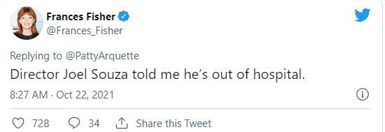I mbetur i plagosur gjatë xhirimeve të filmit “Rust”, regjisori i tij Joel Souza ndodhet në gjendje të mirë shëndetësore dhe ka dalë nga spitali. Lajmi është konfirmuar nga një anwtare e kastit, aktorja Frances Fisher.