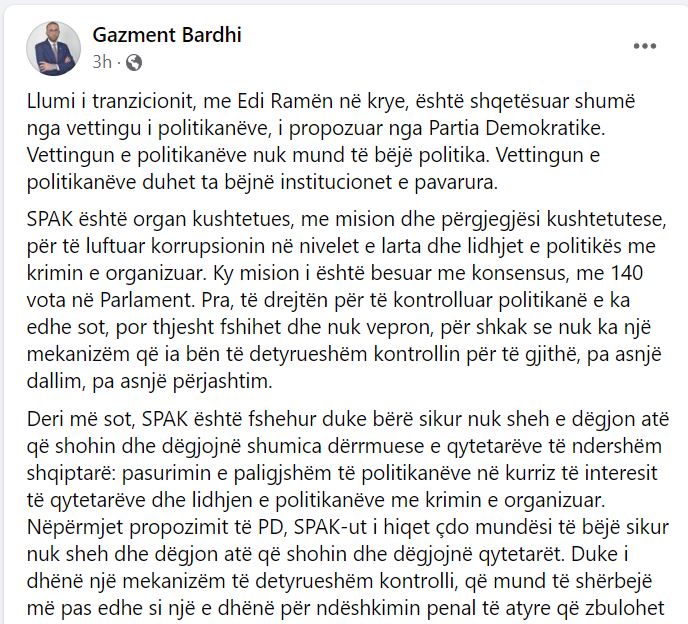 “Llumi i tranzicionit, me Edi Ramën në krye, është shqetësuar shumë nga vettingu i politikanëve, i propozuar nga Partia Demokratike. Vettingun e politikanëve nuk mund të bëjë politika. Vettingun e politikanëve duhet ta bëjnë institucionet e pavarura. SPAK është organ kushtetues, me mision dhe përgjegjësi kushtetutese, për të luftuar korrupsionin në nivelet e larta dhe lidhjet e politikës me krimin e organizuar. Ky mision i është besuar me konsensus, me 140 vota në Parlament. Pra, të drejtën për të kontrolluar politikanë e ka edhe sot, por thjesht fshihet dhe nuk vepron, për shkak se nuk ka një mekanizëm që ia bën të detyrueshëm kontrollin për të gjithë, pa asnjë dallim, pa asnjë përjashtim. Deri më sot, SPAK është fshehur duke bërë sikur nuk sheh e dëgjon atë që shohin dhe dëgjojnë shumica dërrmuese e qytetarëve të ndershëm shqiptarë: pasurimin e paligjshëm të politikanëve në kurriz të interesit të qytetarëve dhe lidhjen e politikanëve me krimin e organizuar.” – shkruan Bardhi.