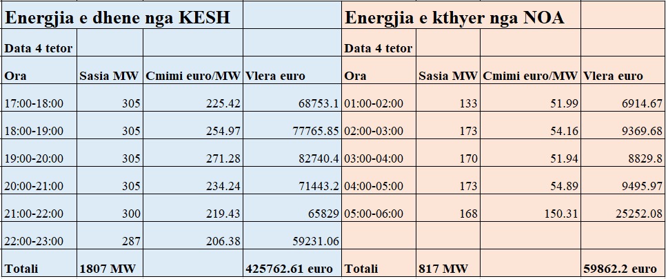 Për periudhën nga 1 tetori deri në 13 tetor KESH i ka dhënë NOA-s në total 10 mijë e 417 mega vat energji, të cilat në orët e dorëzuar sipas çmimeve në bursë kanë patur një vlerë totale prej 2 milionë 620 mijë eurosh. Për të njëjtën periudhë NOA i ka kthyer KESH-it mbapsht 12 mijë e 200 mega vat energji, të cilat në profilet kur janë dorëzuar kanë patur një vlerë totale prej 1 milionë 557 mijë euro. Pra në vetëm 10 ditë shkëmbime, Kaskadës së Drinit i janë vjedhur gati 1 milionë e 100 mijë euro.