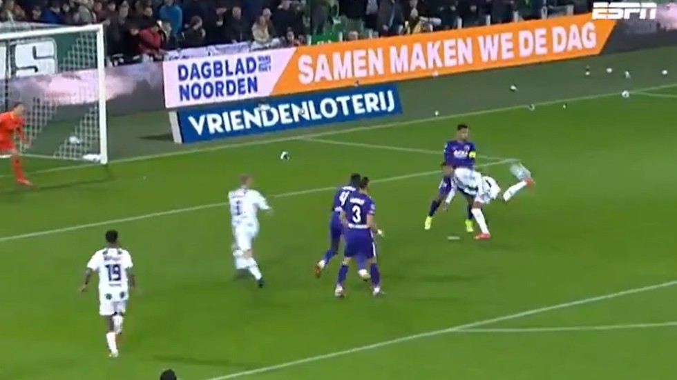 21-vjeçari belg bëri goditjen akrobatike në mes të pjesës së parë. Goli spektakolar hutoi shokun e tij të skuadrës Michael de Leeuw, i cili reagoi ndaj golit të bujshëm duke vënë duart drejt kokës i habitur në sekondat e mëpasshme.