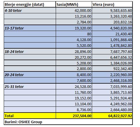 Për datat nga 4 tetori deri në 31 tetor janë blerë në treg të lirë mbi 237 mijë MWh energji çka bën që çmimi mesatar me të cilën është siguruar një megavat/orë është rreth 273 euro/ MWh.