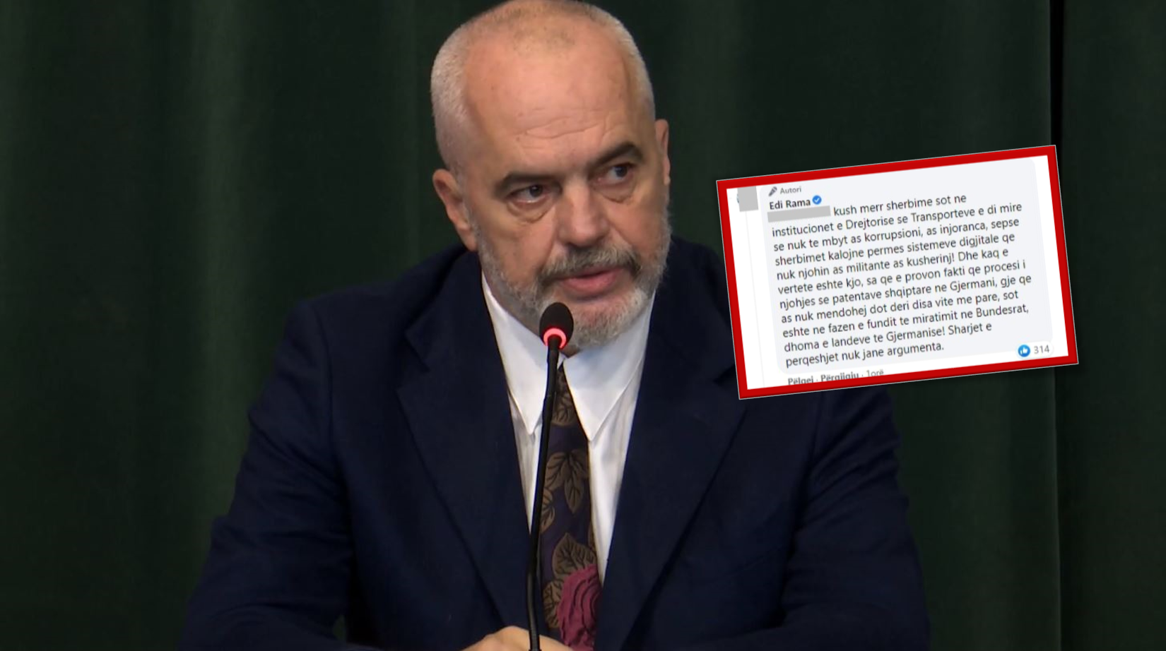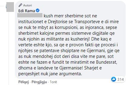 “kush merr shërbime sot në institucionet e Drejtorisë së Transporteve e di mirë se nuk të mbyt as korrupsioni, as injoranca, sepse shërbimet kalojnë përmes sistemeve digjitale që nuk njohin as militantë as kushërinj! Dhe kaq e vërtëtë është kjo, sa që e provon fakti që procesi i njohjes së patentave shqiptare në Gjermani, gjë që as nuk mendohej dot deri disa vite më parë, sot është në fazën e fundit të miratimit në Bundesrat, dhoma e landeve të Gjermanisë! Sharjet e përqeshjet nuk janë argumenta.”- shkruan Rama.