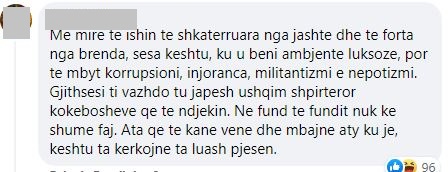 “Më mirë të ishin të shkatërruara nga jashtë dhe të forta nga brenda, sesa kështu, ku u bëni ambjente luksoze, por të mbyt korrupsioni, injoranca, militantizmi e nepotizmi. Gjithsesi ti vazhdo t’u japësh ushqim shpirtëror kokëboshëve që të ndjekin. Në fund të fundit nuk ke shumë faj. Ata që të kanë vënë dhe mbajnë aty ku je, kështu ta kërkojnë ta luash pjesën.”- u shpreh qytetari.