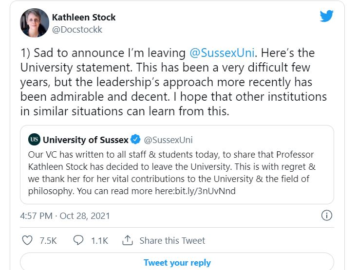 “Universiteti ka qenë i qëndrueshëm dhe i qartë se të gjithë në komunitetin tonë kanë të drejtë të punojnë dhe të mësojnë, pa ngacmime të çdo lloji, gjë që nuk ka qenë rasti për Profesor Stock,” tha Tickell. Ai shtoi se është e paligjshme të diskriminosh këdo “në bazë të seksit dhe besimit filozofik”.