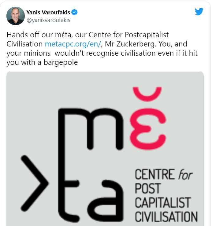 Në një seri postimesh në Tëitter të premten, Varoufakis i tha themeluesit të Facebook që të mbante ‘duart larg Meta-s sonë’ – duke iu referuar ‘Qendrës për Qytetërimin Postkapitalist’ me qendër në Athinë. Qendra kërkimore jofitimprurëse liston deputetin grek në një bord këshillues që përfshin studiuesin Noam Chomsky, muzikantin Brian Eno, regjisorin Ken Loach, ekonomistin James K. Galbraith dhe filozofin Slavoj Zizek.