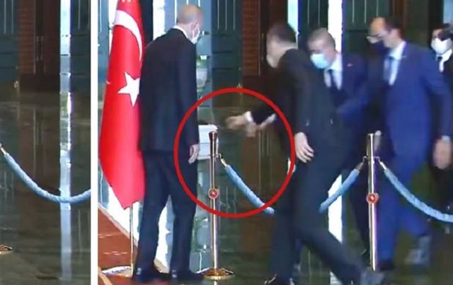 Në videon e xhiruar më 29 tetor, kur Turqia shënoi 98-vjetorin e themelimit të Republikës Turke, Erdogani shihet duke qëndruar mes flamujve turq në pallatin e tij presidencial pasi pranoi urimet nga të ftuarit për Ditën e Republikës. Pas përfundimit të ceremonisë, Erdogan kthehet majtas për t’u larguar nga salla, duke ecur me vështirësi, me këmbët e përkulura dhe trupin duke lëvizur përpara, ndërsa duart i mbeten pa lëvizje. Asistentët e tij i heqin me ngut pengesat para tij për t’i hapur rrugën.
