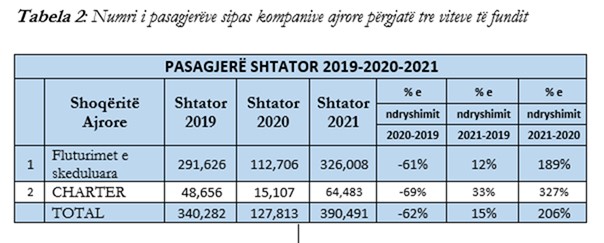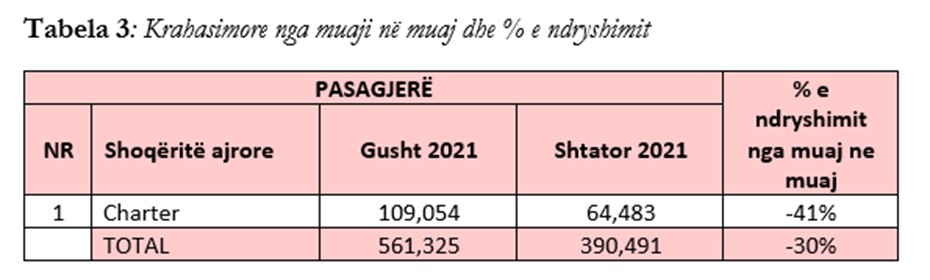 Sipas Autoritetit të Aviacionit Civil, gjithsej fluturuan me charter-a 64 mijë pasagjerë, me rritje prej 33% në krahasim me 2019-n dhe 327% në raport me shtatorin 2020. Përmes charter-ave u realizuan 17% e fluturimeve në shtator.