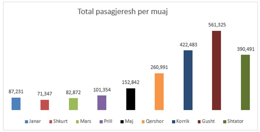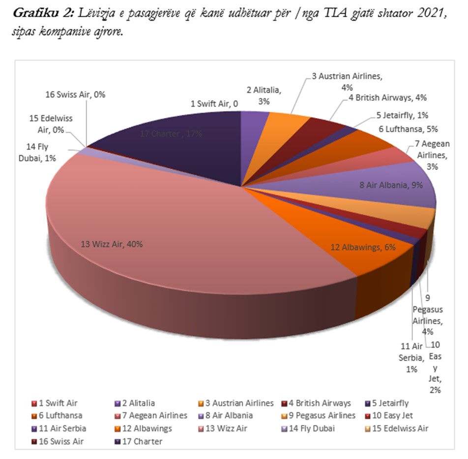 Në ndarjen e tregut sipas operatorëve, më e madhi është WIZZ Air, përmes të cilit kanë udhëtuar 40% e pasagjerëve. Operatori hungarez me kosto të ulët ka shtuar ndjeshëm destinacionet muajt e fundit.