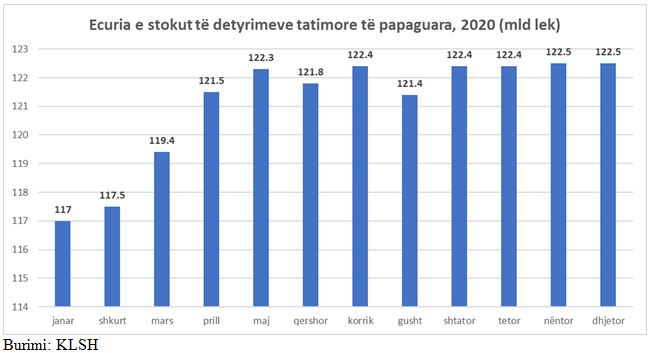 Gjendja e detyrimeve të papaguara në afat në fillim të vitit 2020 ishte 116.9 miliardë lekë dhe në fund të vitit 2020 arriti në vlerën 122.4 miliardë lekë, duke rezultuar në një rritje neto në vlerën 5.4 miliard lekë.