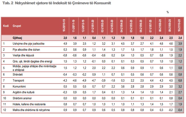 Rritja vjetore e çmimeve në muajin Tetor është ndikuar kryesisht nga grupi “Ushqime dhe pije joalkoolike” me +1,33 pikë përqindje, pasuar nga grupi “Transporti” me +0,36 pikë përqindje. Çmimet e grupit “Qira, ujë, lëndë djegëse dhe energji” me +0,24 pikë përqindje. Çmimet e grupit “Komunikimi” me +0,10 pikë përqindje. Çmimet e grupit “Argëtim dhe kulturë” me +0,09 pikë përqindje. Çmimet e grupeve “Veshje dhe këpucë” dhe “Hotele, kafene dhe restorante” kanë kontribuar me +0,08 pikë përqindje secili. Çmimet e grupit “Pije alkoolike dhe duhan” kanë kontribuar me +0,07 pikë përqindje. Çmimet e grupit “Mobilje, pajisje shtëpie dhe mirëmbajtje e shtëpisë” kanë kontribuar me +0,06 pikë. Çmimet e grupit “Shëndeti” kanë kontribuar me +0,03 pikë përqindje. Çmimet e grupit “Shërbimi arsimor” kanë kontribuar me +0,01 pikë përqindje. Çmimet e grupit “Mallra dhe shërbime të ndryshme” kanë kontribuar me -0,03 pikë.