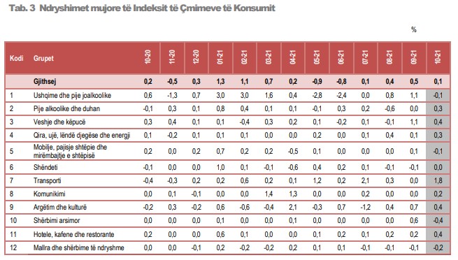 Krahasuar me muajin Tetor 2020, rritja më e madhe e çmimeve vërehet në grupin “Transporti” me 6,8 %, pasuar nga grupet “Ushqime dhe pije joalkoolike” me 3,9 %, “Komunikimi” me 3,2 %, “Argëtim dhe kulturë” me 2,7 %, “Veshje dhe këpucë” me 2,2 %, “Pije alkoolike dhe duhan” dhe “Hotele, kafene dhe restorante” me 1,9 % secili, “Qira, ujë, lëndë djegëse dhe energji” me 1,2 %, “Mobilje, pajisje shtëpie dhe mirëmbajtje e shtëpisë” dhe “Shëndeti” me 0,8 % secili, “Shërbimi arsimor” me 0,4 %. Ndërsa, grupi “Mallra dhe shërbime të ndryshme” u ul me 0,4 %. Brenda grupit të ushqimeve çmimet e nëngrupit “vajra dhe yndyra” u rritën me 7,7 %, pasuar nga nëngrupet “fruta” me 6,9 %, “bukë dhe drithëra” me 5,8 %, “sheqer, reçel, mjaltë, çokollata dhe ëmbëlsira” me 4,7 %, “zarzavate përfshirë patatet” me 3,5 %, “qumësht, djathë dhe vezë” me 3,3 %, etj.