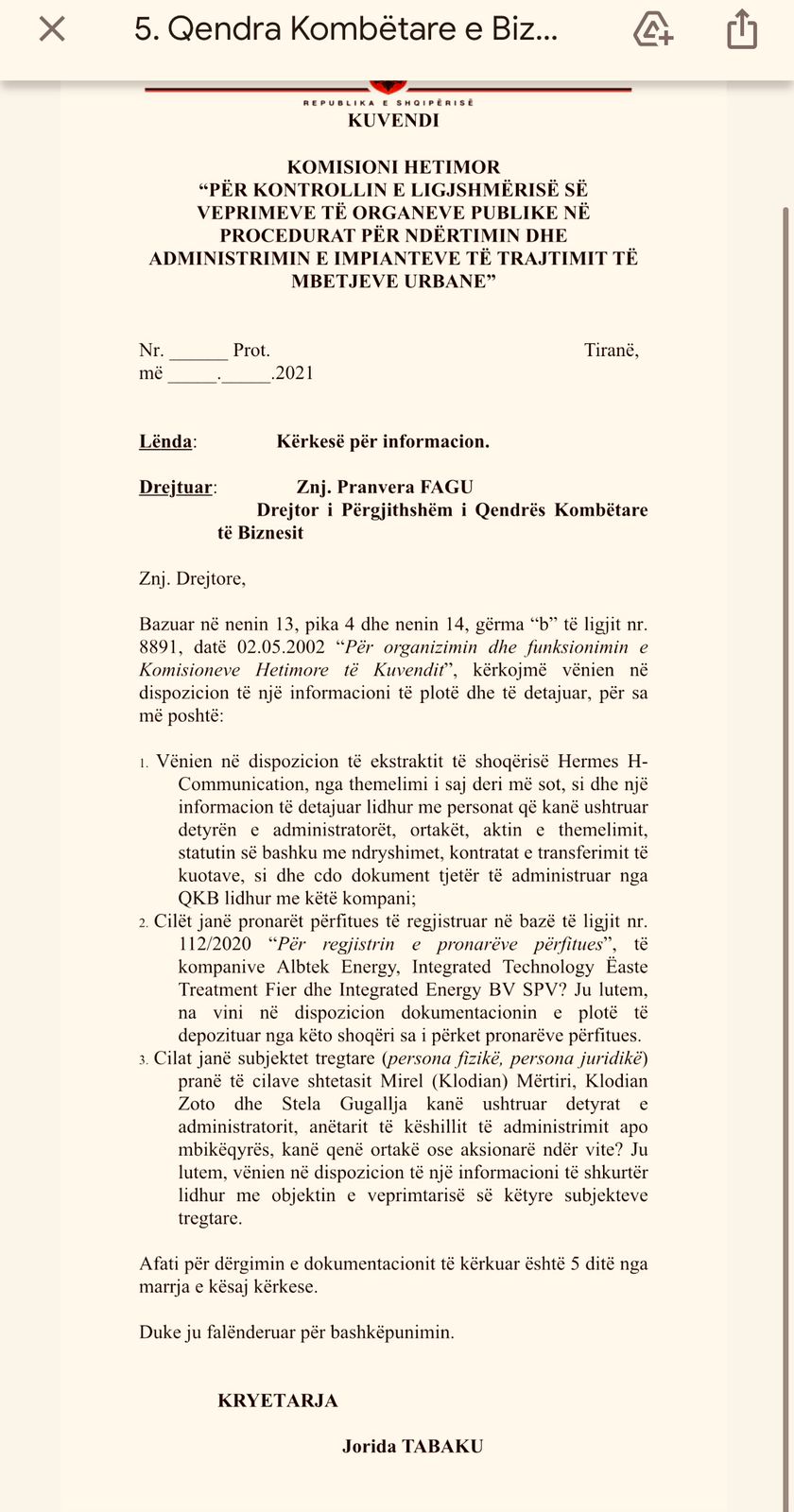 Kryetarja e Komisionit Jorida Tabaku i ka dërguar kërkesat që nga Këshilli i Ministrave, Ministritë e Financave, Ministrinë e Mjedisit, atë të Infrastrukturës e Mjedisit, te Kontrolli i Lartë i Shtetit, bashkitë ku veprojnë incineratorët, përfshirë bashkitë e Durrësit dhe Kavajës, disa drejtori që mund të zbardhin lëvizjet e parave për incineratorët, lëvizjet e disa zyrtarëve me administratorët e incineratorëve, lidhjet e mëparshme të biznesit mes pronarëve të kompanive përfituese dhe ministrave të qeverisë së Edi Ramës.