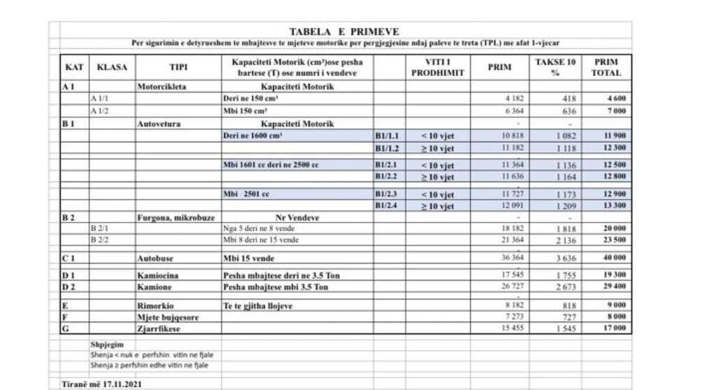 Shoqëria më pas njofton AMF-në brenda 30 ditësh kalendarike përpara aplikimit të tarifave të reja të primit dhe depoziton në Autoritet bazat teknike, faktorët e riskut dhe vlerësimet aktuariale të përdorura për llogaritjen e këtyre primeve, të shoqëruara me opinionin e aktuarit të autorizuar të shoqërisë.