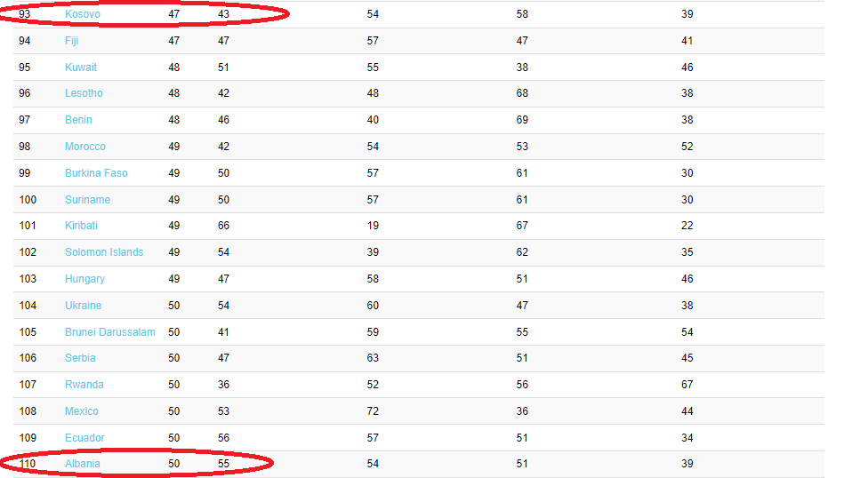 Kurse, Shqipëria është renditur në vendin e 110, duke u vlerësuar me 50 pikë.