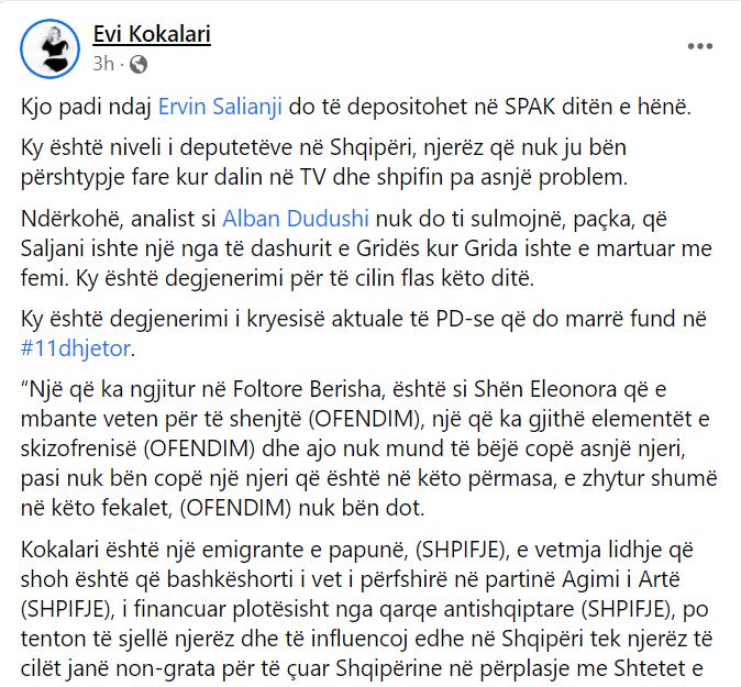 “Kjo padi ndaj Ervin Salianji do të depositohet në SPAK ditën e hënë. Ky është niveli i deputetëve në Shqipëri, njerëz që nuk ju bën përshtypje fare kur dalin në TV dhe shpifin pa asnjë problem. Ndërkohë, analist si Alban Dudushi nuk do ti sulmojnë, paçka, që Saljani ishte një nga të dashurit e Gridës kur Grida ishte e martuar me femi. Ky është degjenerimi për të cilin flas këto ditë. Ky është degjenerimi i kryesisë aktuale të PD-se që do marrë fund në #11dhjetor.” – shkruan Kokalari.