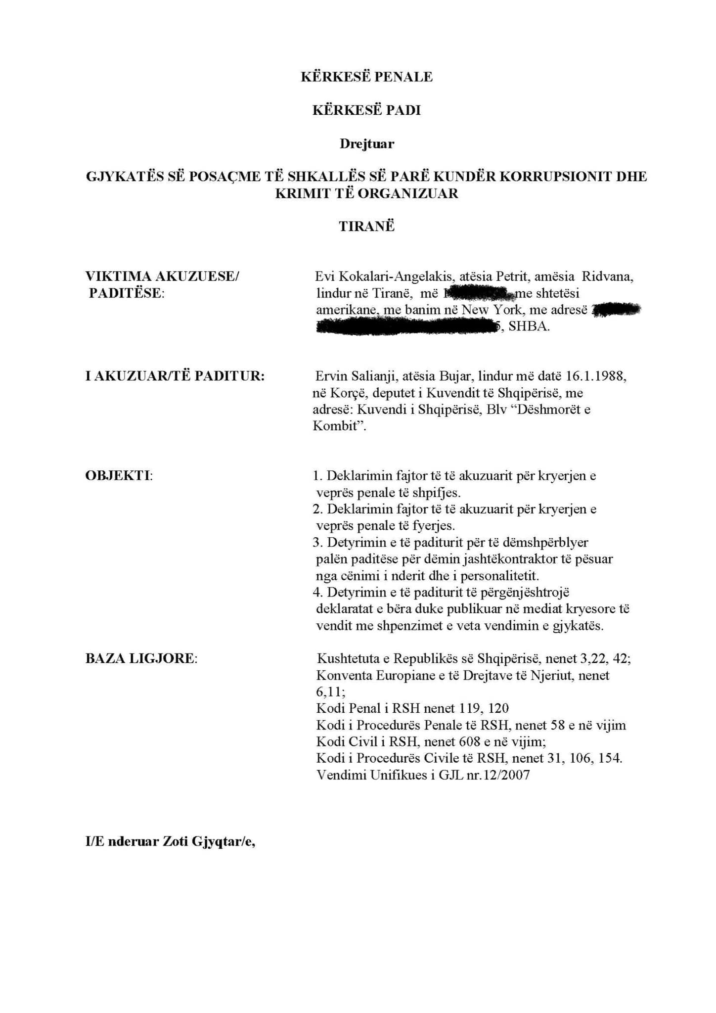 Ajo e akuzon Salianjin për shpifje e fyerje, gjatë deklaratave të tij në një emision televizi. Kokalari ka futur në postimin e saj edhe deklaratat e Salianjit, mbi të cilat ka ngriotur padinë.