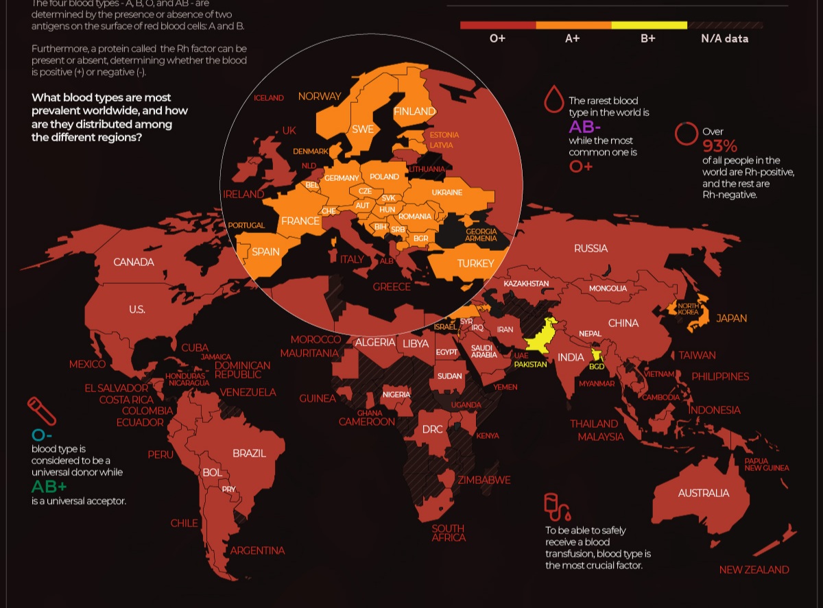 Në vendin tonë sipas hartës, mbizotëron grupi i gjakut zero. Shqipëria është një nga tre vendet e Europës, së bashku me Italinë dhe Greqinë, ku mbizotëron zero pozitiv. Ndërsa në Europë më i zakonshëm është grupi A i gjakut. Pothuajse 40% e popullsisë në Danimarkë, Norvegji, Austri dhe Ukrainë kanë këtë lloj grupi, sipas Visual capitalist.
