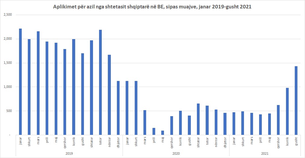 Në gusht, aplikimet ishin më të larta dhe se muajt e fundit përpara se të fillonte pandemia, dhjetor 2019 dhe janar e shkurt 2020. (shiko grafikun: Aplikimet për azil nga shtetasit shqiptarë në BE, sipas muajve, janar 2019-gusht 2021)