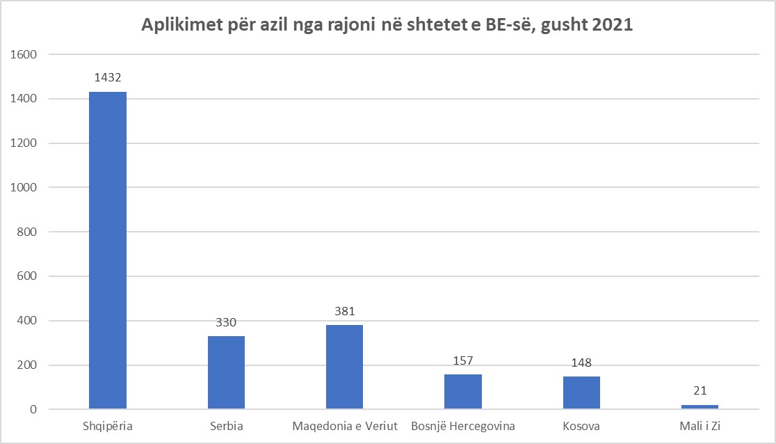 Në krahasim me shtetet e tjera të rajonit, shqiptarët mbajnë rekord për numrin e aplikimeve në gusht, duke rezultuar gati katër herë më të larta sesa shteti i dytë pas nesh, që është Maqedonia e Veriut. (shiko grafikun: Aplikimet për azil nga rajoni në shtetet e BE-së, gusht 2021)