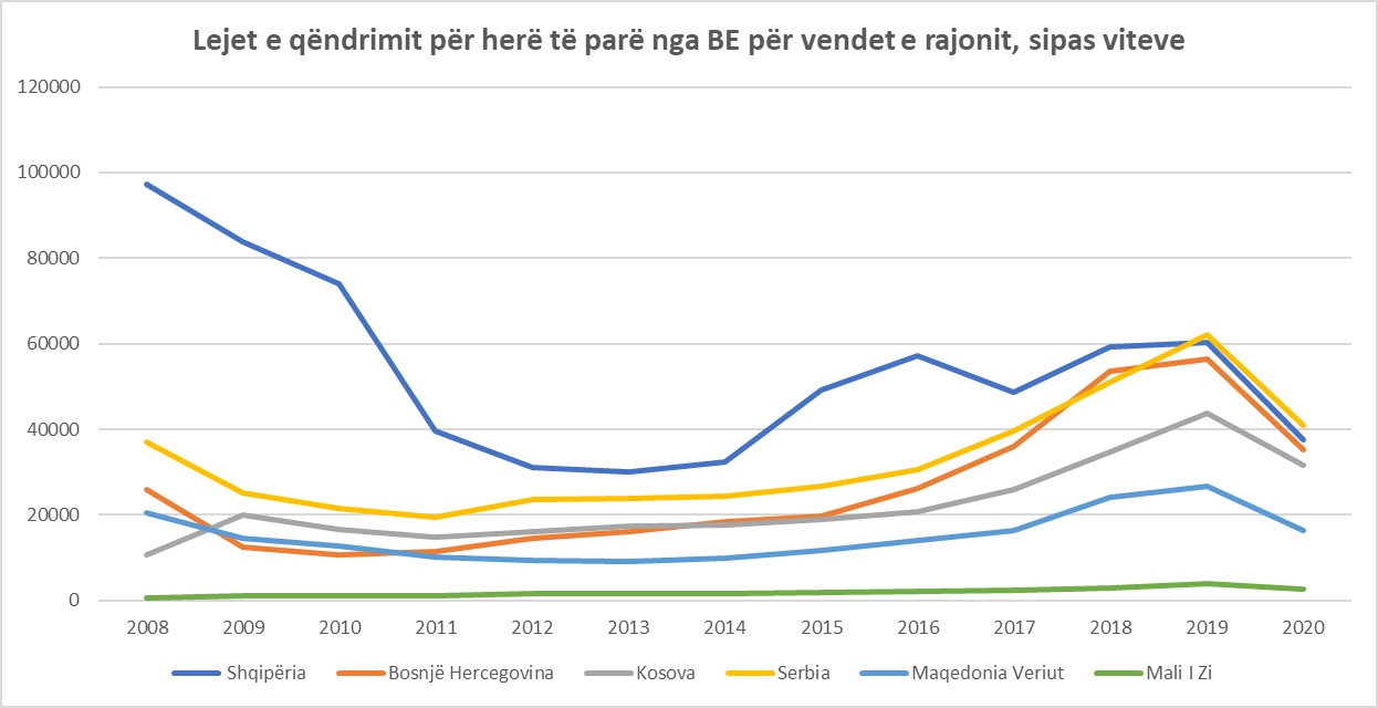 Në krahasim me vendet e tjera të rajonit, Shqipëria mban rekordin për numrin e shtetasve të saj që kanë zgjedhur të jetojnë e punojnë në një shtet të Bashkimit Europian. Për të njëjtën periudhë (2008-2020) kanë marrë leje qëndrimi për herë të parë rreth 426 mijë serbë, 337 mijë boshnjakë, 285 mijë shtetas të Kosovës, 195 mijë nga Maqedonia e Veriut dhe më pak se 20 mijë nga Mali i Zi.