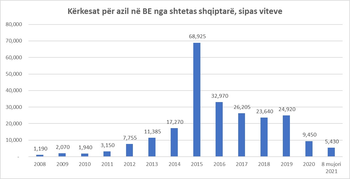 Sipas viteve, numri më i madh i aplikimeve për mbrojtje ndërkombëtare (azil) është shënuar në vitin 2016, me gati 69 mijë, ku gati 80% kishin destinacion Gjermaninë. Vitet e mëvonshme, aplikimet u përgjysmuan, ndërsa në 2019-n u shënua një tendencë rritëse e lehtë. (shiko grafikun: Kërkesat për azil në BE nga shtetas shqiptarë, sipas viteve).