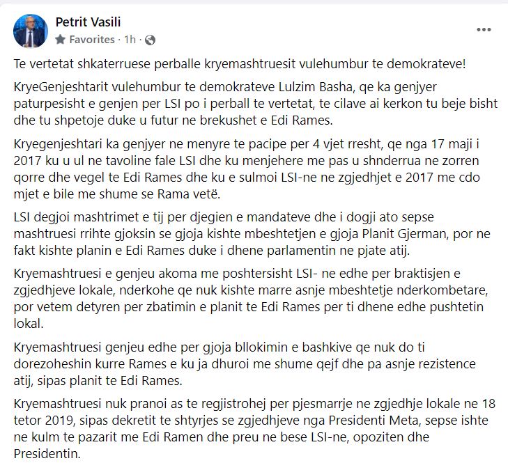 “Të vërtetat shkatërruese përballë kryemashtruesit vulëhumbur të demokratëve! KryeGënjeshtarit vulëhumbur të demokratëve Lulzim Basha, që ka gënjyer paturpësisht e gënjen për LSI po i përball të vërtetat, të cilave ai kërkon t’u bëjë bisht dhe t’u shpëtojë duke u futur në brekushet e Edi Ramës. Kryegënjeshtari ka gënjyer në mënyrë të pacipë për 4 vjet rresht, që nga 17 maji i 2017 ku u ul në tavolinë falë LSI dhe ku menjëherë më pas u shndërrua në zorrën qorre dhe vegël të Edi Ramës dhe ku e sulmoi LSI-në në zgjedhjet e 2017 me çdo mjet e bile më shumë se Rama vetë.” – shkruan Vasili.