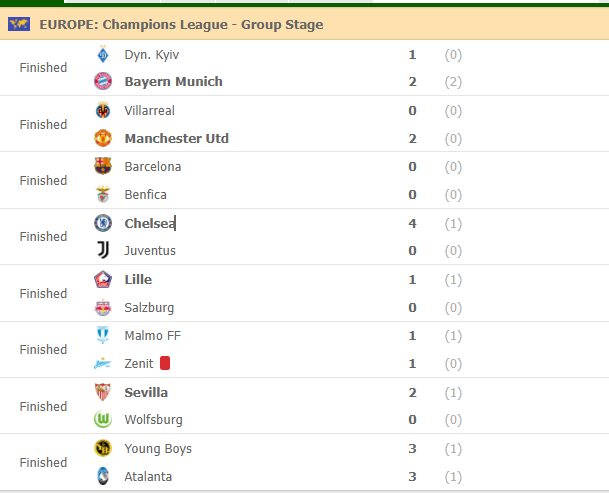 Në sfidat e tjera Bayern Munich ka fituar ndaj Dinamo Kievit. Ndërsa Barcelona ka barazuar ndaj Benfikës.