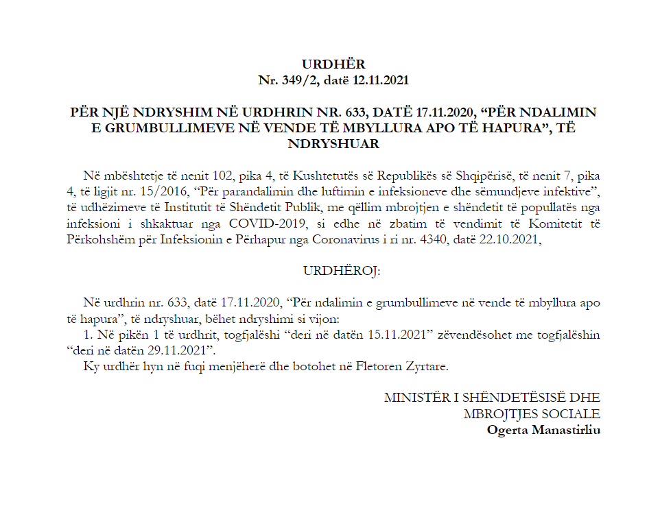 Ndryshimi vjen nga urdhri i mëparshëm që ndalonte grumbullimet deri në datë 15 nëntor por duket se festa e Pavarësisë në fund të muajit ka bërë që të shtyhet efekti deri në datë 29 nëntor.