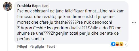 “Pse nuk shkruani që janë falsifikuar firmat. Unë nuk kam firmosur dhe rezultoj që kam firmosur. Ishit ju që më morët dhe çfarë iu thashë? Pse nuk denonconi z.Agron. Ç’është ky qëndrim dualist? Vallë e do PD më shumë se unë? Zhgënjim total për ju dje për atë që përfaqësoni ju.”-shkruan zonja në një postim të deputetit Shehaj. Një akuzë e fortë kjo, por që Shehaj ende nuk i është përgjigjur.