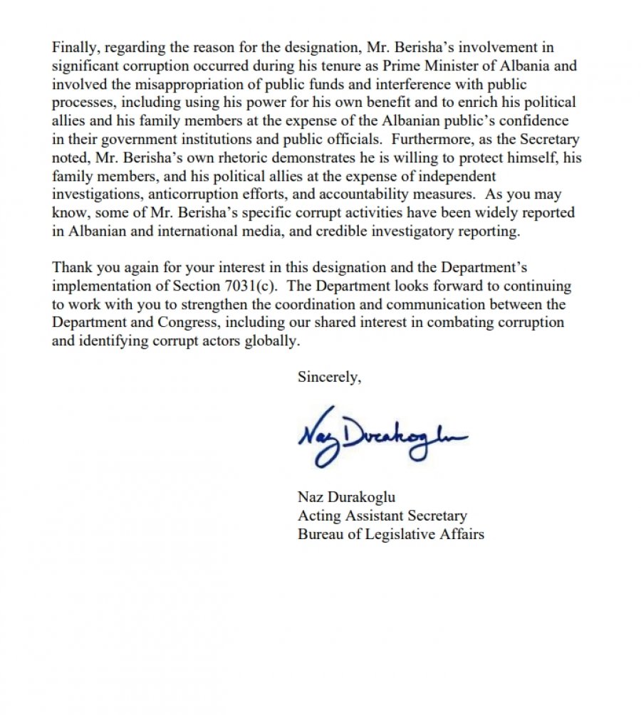 Për sa i përket emërtimit publik të z.Berisha, Departamenti mund të konfirmojë që ka ndjekur procedurat e duhura për të vendosur se ai ka qenë i përfshirë në korrupsion domethënës në kohën që ishte zyrtar publik. Kjo përfshin një rishikim të detajuar nga të gjitha palët e interesuara të politikave të Departamentit duke përfshirë edhe zyrën rajonale, si edhe rishikimin nga Zyra e Këshilltarit Ligjor të Departamentit.