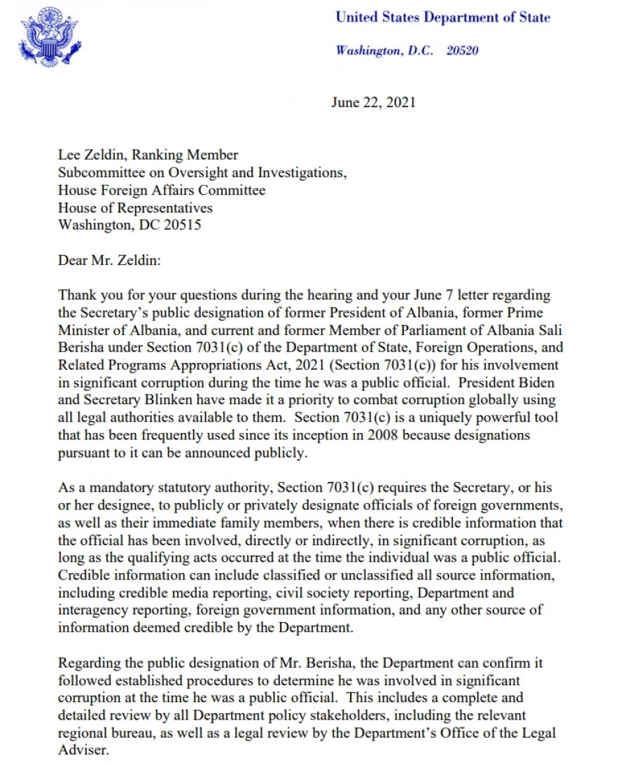 Departamenti Amerikan i Shtetit (DASH) dhe kongresmeni konservator Lee Zeldin, kanë pasur një korrespodencë lidhur me shpalljen non-grata të Sali Berishës.